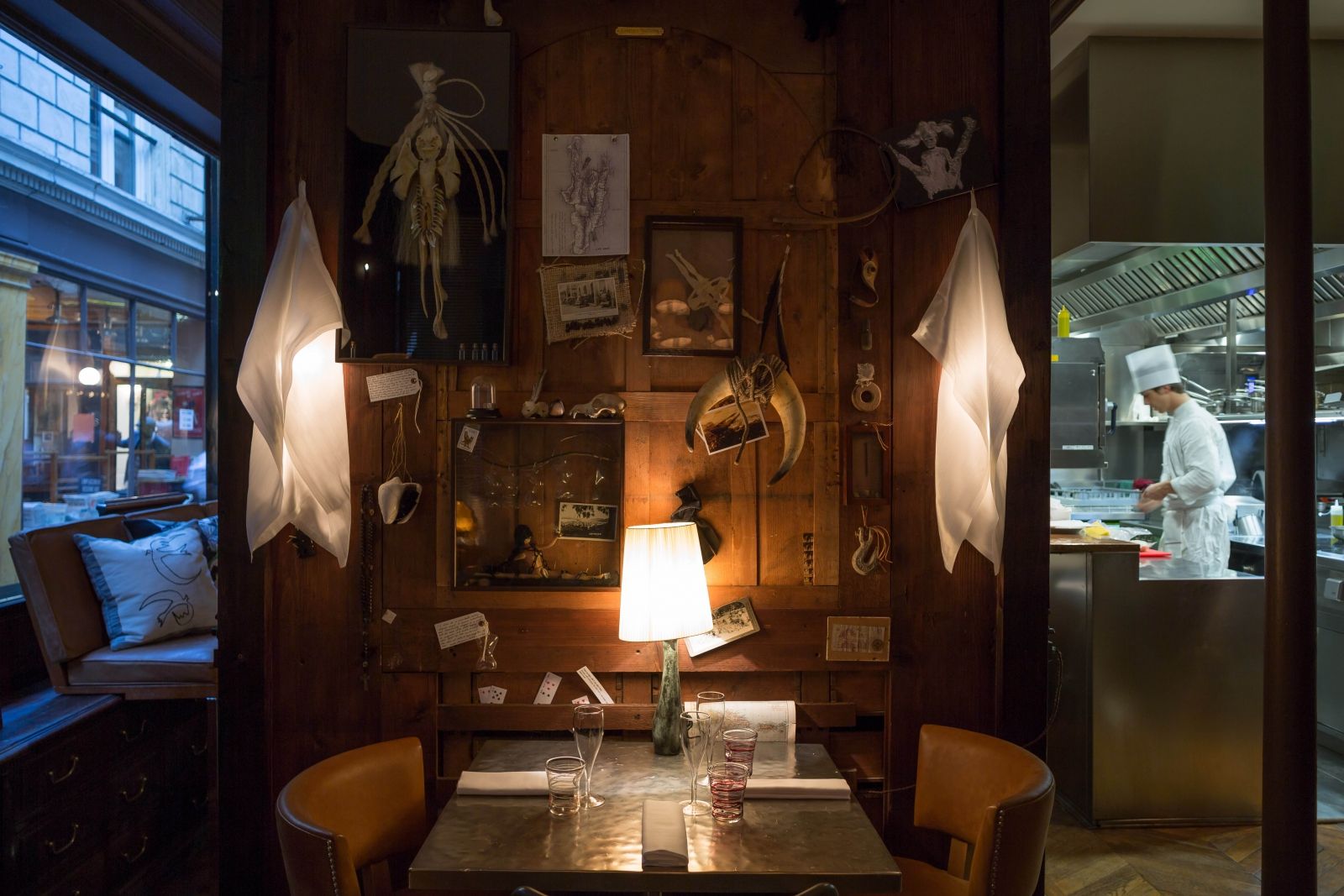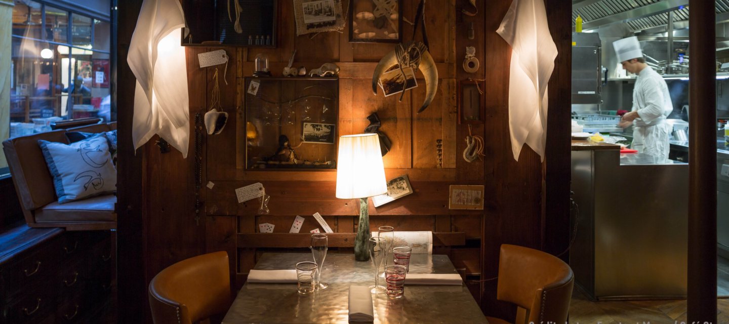 A l’origine, les locaux du numéro 47 étaient un atelier de gravure réputé du XIXème. L’adresse chic qui avait parmi ses clients l’Elysée déménage en 2008 et laisse l’adresse orpheline. Désormais inscrit au registre des Monuments Historiques de France, ce lieu chargé d’histoire a réouvert après 6 ans de fermeture. La renaissance des lieux fut du sol au plafond. Nouvelle décoration pétillante et atypique signée Philippe Starck. Difficile d’imaginer qu’il s’agit d’un restaurant de l’extérieur. A l’entrée, un lynx et un loup embijoutés se disputent la vedette pour accueillir les clients. A l’intérieur, l’ambiance y est tamisée, comme celle d’un cabinet de curiosités. Un espace café à l’entrée, plutôt sombre, avec de gros cadres en bois et des bougies sur les cheminées. Puis, la salle de restaurant, plus cosy avec de beaux gros coussins et un mur composé d’une multitude de photos en noir et blanc. Pleine vue sur la cuisine ouverte, « Massimiliano tenait à être transparent sur sa cuisine » nous précise le directeur de salle. La table du chef, attenant à la cuisine et d’un doré presque éblouissant renvoie encore à cette volonté de faire les choses toujours autrement. Enfin, le restaurant construit comme une boucle se termine par le petit salon, une salle emblématique de 8 couverts où « ministres et grands hommes d’affaire » viennent souvent déjeuner.