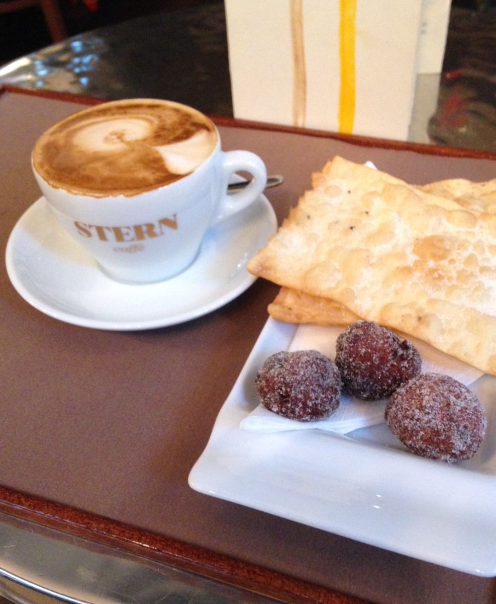 Qui dit février dit mois des carnavals, et c’est au tour de celui de Venise de prendre la tête d’affiche. Du 18 au 28 février, la ville la plus romantique du monde vit au rythme des festivités. Et à ce moment privilégier de l’année, elle met à l’honneur des dolci, comprenez douceurs à se damner. Le Café Stern sert deux de ses spécialités sucrées carnavalesques. La Frittelle, une sorte de beignet au goût subtil d’agrumes. Mandarine ? Citron ?Nous n’aurons pas la réponse, gardée secret défense. Ce qui est sûr, c’est que ces petites boules sont bien moins grasses et lourdes en bouche qu’un beignet ou un donuts à l’américaine. Les Crostoli aussi appelés Chiacchiere ou Frappe sont à mi-chemin entre notre version française de l’oreillette (spécialité provençale servie pour Mardi gras) et la bugne (idem). Craquantes et tout juste dorées, à peine sucrées, elles sont parfaites pour finir ce goûter vénitien de carnaval. Nous dégustons le tout avec un cappuccino servi dans une tasse à l’effigie du restaurant. Belle mousse de lait et goût chocolaté en fin de bouche, il est comme on le préfère : pas trop sucré, fort en saveurs et onctuosité.