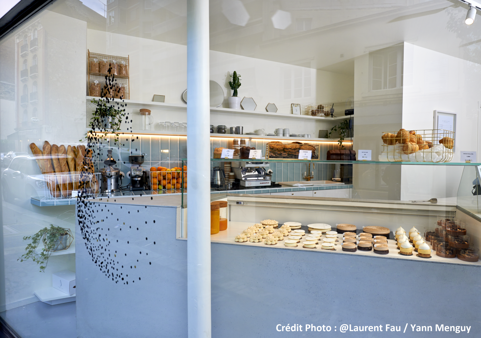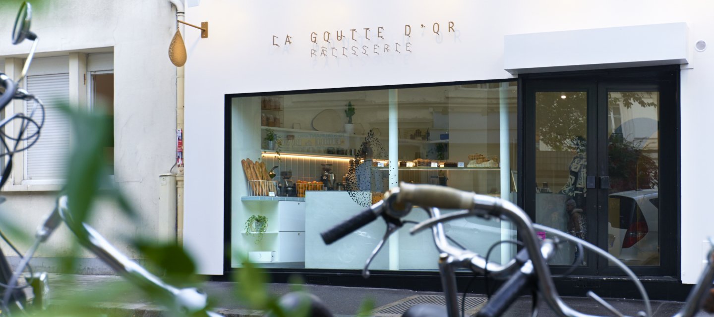 Si vous pensiez qu’à La Goutte d’Or on fait dans la pâtisserie sophistiquée, vous avez tout faux. Son maître mot : la simplicité. Autant dans l’assiette que dans le décor et la mise en scène de sa boutique, Yann Menguy a tout imaginé avec cette sobriété qu’il affectionne tant. Ici, pas de pâtisserie-bijou, point de « cloches en verre ». Une simple vitrine et quelques paniers en fer doré pour les viennoiseries. Le style Yann Menguy c’est « respecter les codes de la pâtisserie française en travaillant à la cool ». Et le plus important pour lui dans la conception de sa boutique, c’est d’être « au contact et au plus près des clients ». Le laboratoire est ouvert sur la boutique qui se partage également l’espace avec un petit comptoir pour celles et ceux qui souhaiteraient casser la croute sur place. Le but derrière tout ça ? Créer une dynamique, où l’espace de vente peut aussi devenir celui de dégustation. « On est sur une pâtisserie coffee-shop car on ne se prétend pas 100% coffee-shop ni 100% pâtisserie ». Un concept qui selon son créateur, convient à tous les moments de la journée et s’adapte aux habitudes de chacun. Par exemple, « si le matin une personne vient prendre son café, manger en même temps sa brioche et checker ses mails : on est plus dans l’esprit coffee-shop. L’après-midi on vient plus acheter une pâtisserie que l’on va déguster chez soi, comme dans une pâtisserie traditionnelle».