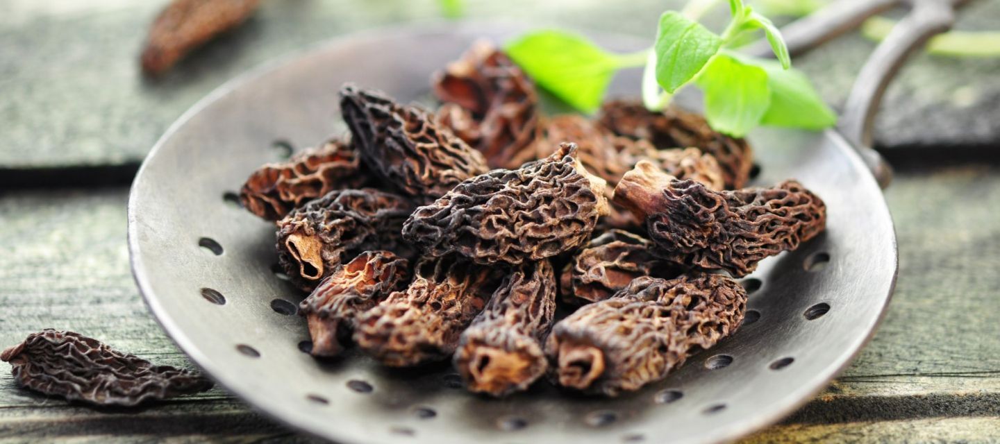 Morilles : Plaisir printanier, la morille se reconnaît grâce à son chapeau alvéolé. À la fois souple et ferme, la morille dégage un parfum caractéristique. Champignon sauvage de climat tempéré, on la trouve en France, dans l’Est, le Sud-Est, en Corrèze et dans le Périgord. Elle pousse principalement dans les sols sablonneux, à la lisière des bois. Elle apprécie particulièrement les terrains tourmentés, les creux et autres cuvettes. C’est pourquoi les plages normandes se sont vues remplies de morilles au printemps 1945, après les bombardements. Elles accompagnent parfaitement bien volailles et aussi poissons blancs.