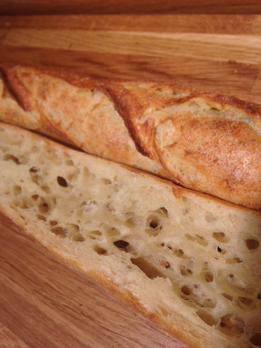A l’intérieur, les critères sont différents mais demeurent tout aussi importants. La couleur de la mie doit être « d’un blanc crème uniforme ». « Plus les baguettes sont blanches à l’intérieur est plus cela révèle un pétrissage intensif qui a oxydé la farine qui crée cette couleur blanche ». Le but de se pétrissage intensif ? donner de la vigueur au pain. Cependant selon notre boulanger, si on pétrit la pâte au bon moment, on obtient un pain qui se tient sans difficulté. Le boulanger qui pétri son pâton pendant des heures est donc un mythe ? Oui et non, Florian nous explique qu’être boulanger aujourd’hui et hier n’a rien à voir. « Les avancées technologiques permettent au boulanger de gagner du temps certes mais le savoir-faire et les critères de qualité sont toujours les mêmes » nous assure-t-il. Autre indicateur qui assure un pétrissage respecté, « une mie bien grasse ». « Cet aspect tout juste brillant, ni trop ni pas assez nous assure une mie hydratée comme il se doit ». Enfin, la mie d’une baguette tradition doit être « au maximum alvéolée », contrairement à une baguette blanche que la boulangerie se refuse de faire qui est bien plus « serrée ». ( NLDR. pas ou peu alvéolée)