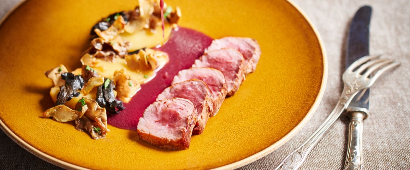 Impressionnez vos convives avec un beau filet de marcassin rôti, sa sauce au vin rouge, petites pommes de terre grenaille, et champignons sauvages. Contrairement à la viande de sanglier, dont la chair est parfois dure et sèche, celle du marcassin (le petit du sanglier) est tendre et moelleuse !-