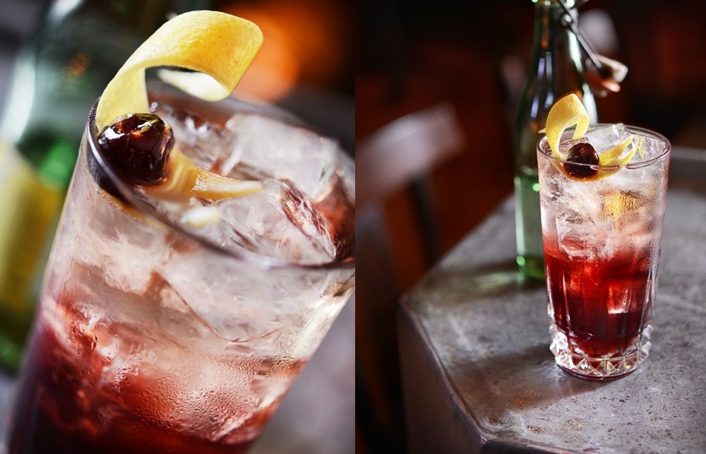 Décorer avec un zeste de citron jaune et une cerise marasquin.