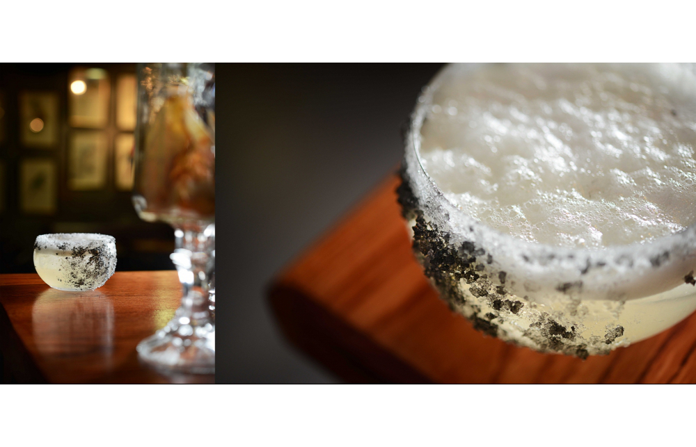 Givrer le bord du verre avec du sel noir d’Hawaii pour une présentation originale.