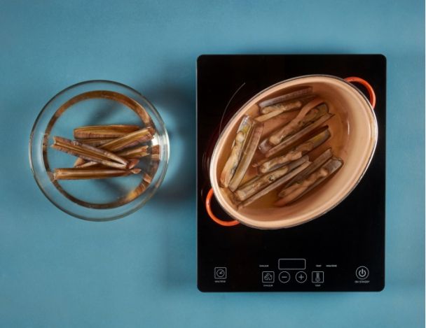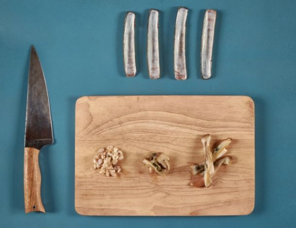 Retirer leur chair et enlever la tête des couteaux, puis tailler la chair en brunoise et la réserver.