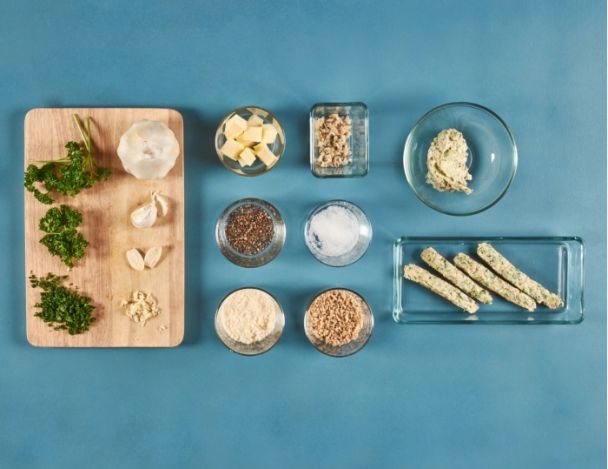 Rincer, sécher, effeuiller et hacher le persil. Peler et hacher l’ail. Couper le beurre en morceaux et le mettre en pommade. Mélanger le tout avec le parmesan et la chapelure. Saler et poivrer.