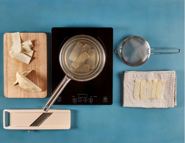Éplucher le céleri. Tailler les bords de la boule de façon à obtenir un long parallélépipède. Dans celui-ci, tailler 4 fines tranches à la mandoline. Les blanchir dans de l’eau bouillante salée pendant 3 à 4 min. Puis les égoutter, les étaler sur un torchon sec et réserver.