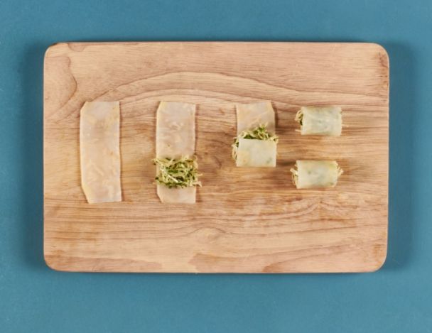 Répartir la julienne de céleri sur chaque tranche de céleri-rave et rouler ensuite chacune d’elles en un joli cannelloni. Les cannellonis se maintiennent fermés une fois roulés, inutile d'ajouter un œuf ou autres composants