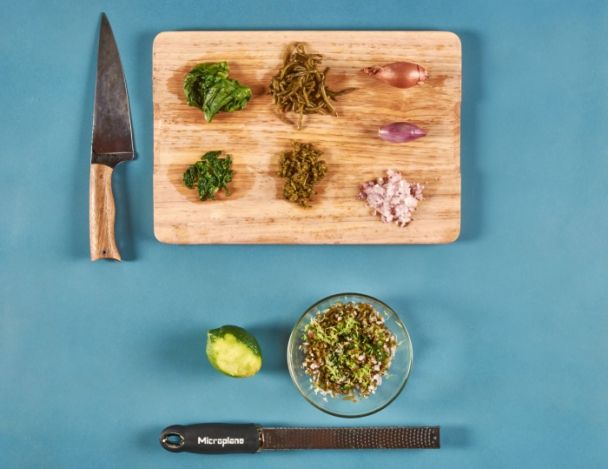 Rincer les algues à l’eau tiède et les hacher. Rincer les salicornes et les tailler en fine brunoise. Éplucher et ciseler les échalotes. Mélanger le tout et râper dessus le zeste du citron vert. Réserver.