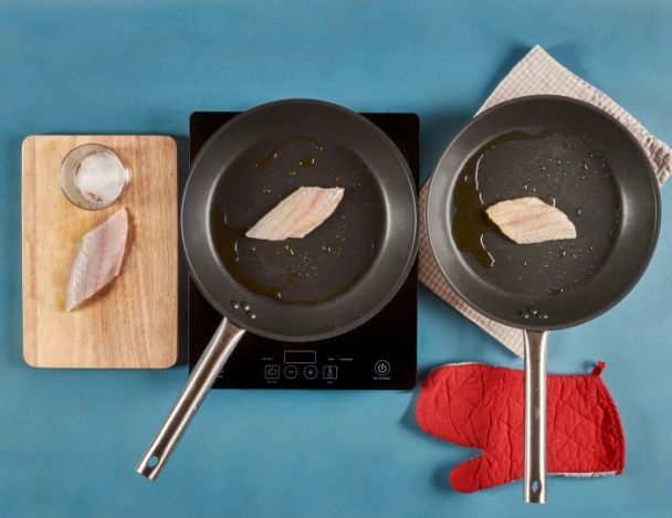 Saler les pavés de bar et les colorer côté peau, dans une poêle chauffée avec un filet d’huile d’olive. Glisser la poêle au four pour 4 à 5 minutes. La sortir et garder le bar au chaud.