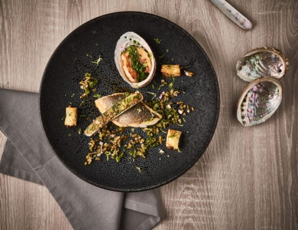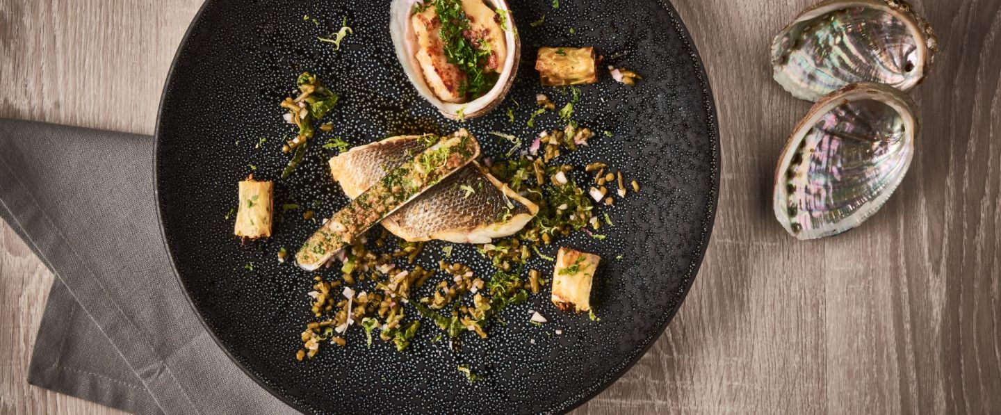 Jérôme Lebau vous propose une recette spécial mélange de la mer : Bar de ligne rôti, couteaux gratinés et ormeaux juste poêlés, cannellonis végétaux à l’huile de sésame, algues en condiments. Ce plat est idéal pour les amateurs de poissons et de crustacés.