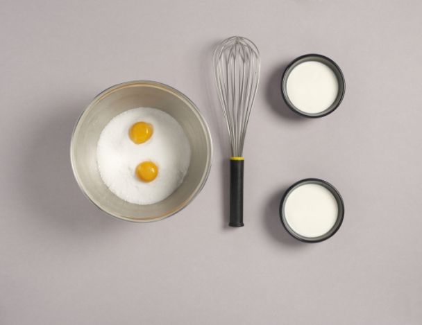 FacileBlanchir les jaunes d'œufs et le sucre. Faire bouillir le lait et la crème.Verser le lait et la crème sur les jaunes d'œufs blanchis.