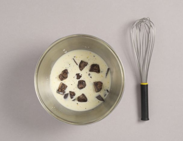 Concasser le chocolat noir, verser la crème anglaise. Mélanger à l'aide d'un fouet.