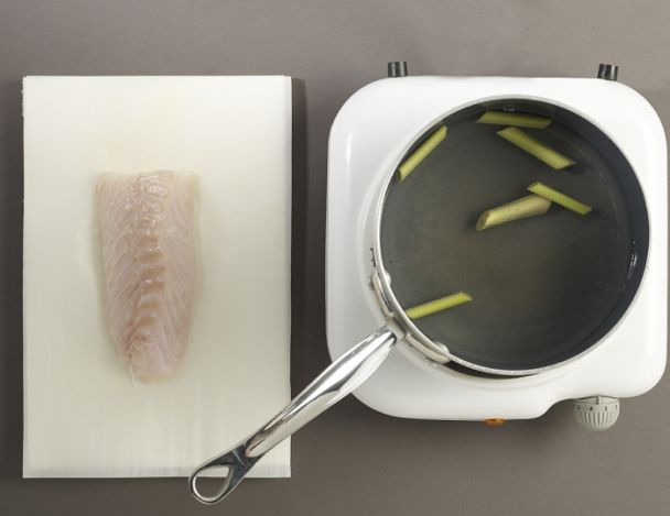 Tailler la citronnelle en bâtonnets. Récupérer le jus et le zeste des citrons. Éplucher le gingembre et le tailler en fine lamelles. Préparer le bouillon aromatisé avec la citronnelle, le jus de citron et les zeste, le gingembre et la moitié d'huile d'olive. Porter à ébullition. Ne pas oublier d'écumer et laisser infuser à couvert pendant 1h.