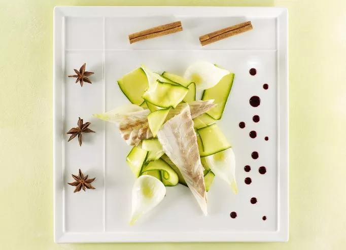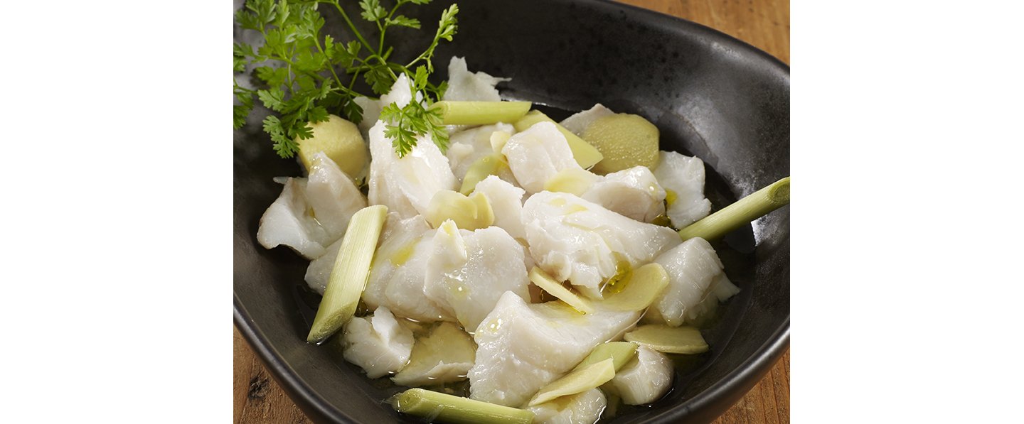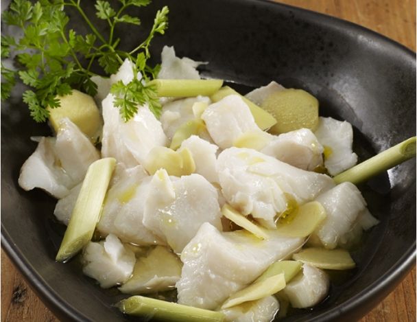Disposer les morceaux de morue avec quelques bâtons de citronnelle et quelques morceaux de gingembre dans un plat creux de présentation. Arroser de quelques louches du bouillon et d'un filet d'huile d'olive. Servir accompagné d'une pomme de terre en robes des champs à la fleur de sel.