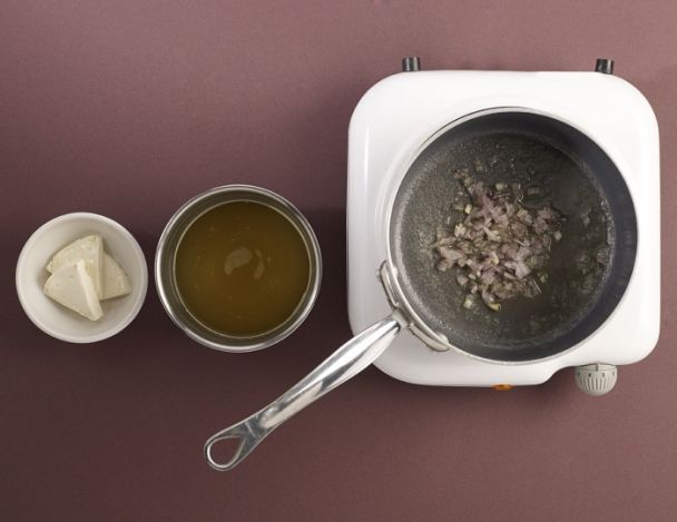 MoyenFaire suer les échalotes avec une noisette de beurre. Ajouter le bouillon de poule et la vache qui rit. Monter à ébullition et laisser cuire 5 minutes à feu doux. Mixer le tout.