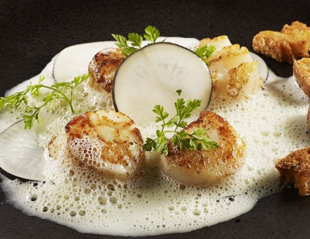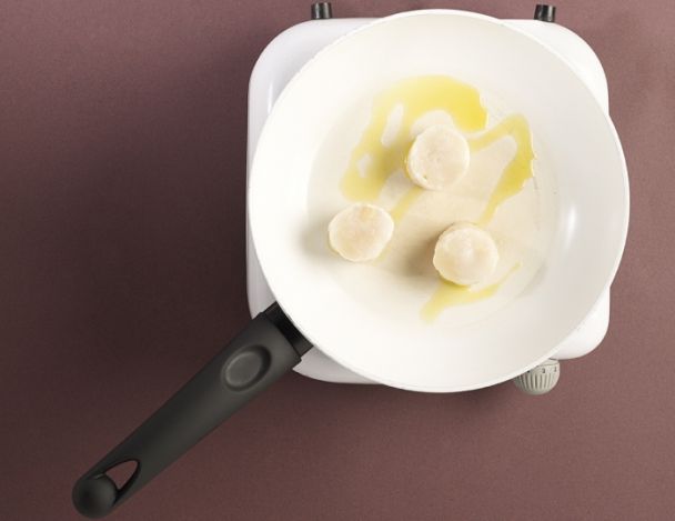 Au moment de passer à table, mettre une poêle très chaude avec un petit filet d'huile d'olive. Poser les Saint-Jacques et laisser croustiller sur chaque face et les réserver.