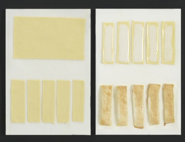 Abaisser la pâte feuilletée à 0,5 millimètres d’épaisseur, couper en rectangle de 10 cm x 3 cm.