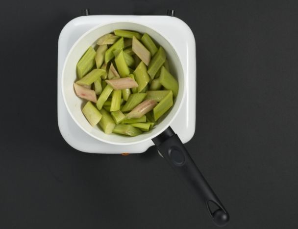 Éplucher et tailler la rhubarbe en tronçons, les faire suer avec la moitié du beurre, couvrir et laisser cuire une dizaine de minutes.
