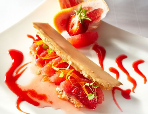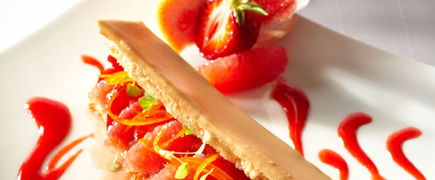 Une touche de fraicheur pour finir votre repas en toute légèreté ? Voici la recette très fruitée d'allumettes aux fraises et pamplemousses roses à la rhubarbe du chef Guy Lassaussaie.