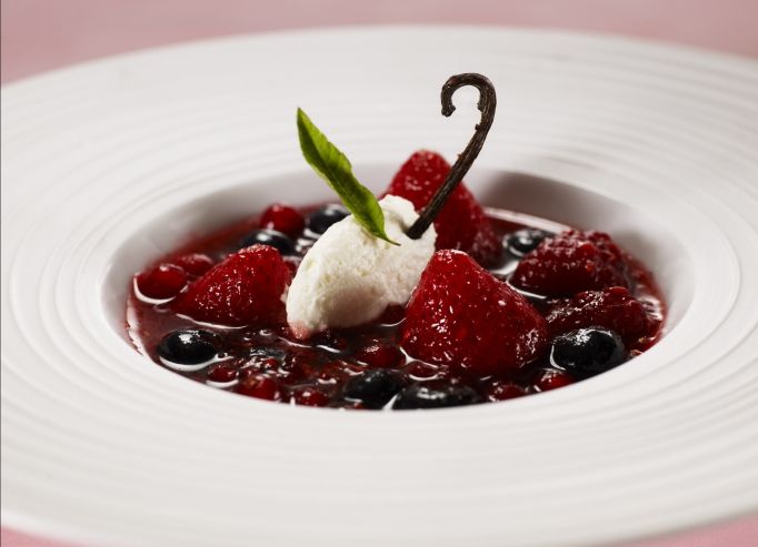 Décorer avec du coulis de fruits les assiettes.