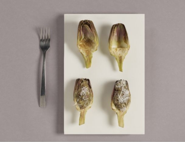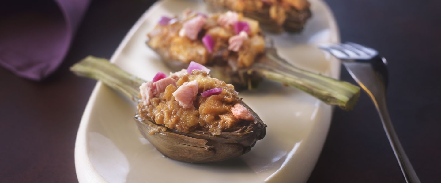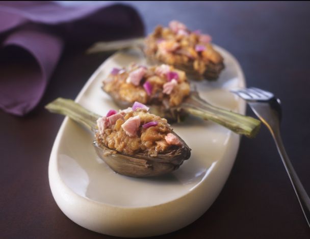 Parfumer avec quelques gouttes d'huile de noisette.bGarnir les demi-artichauts avec la farce et réserver.