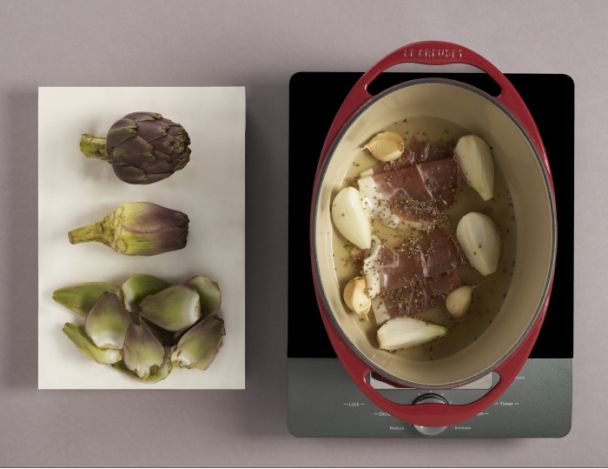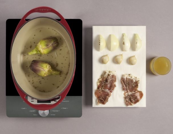MoyenDans une cocotte, faire un fond de barigoule: ail en chemise, oignon, poitrine fumée, vin, blanc, bouillon de poule, graines d'anis vert et de coriandre, sel.