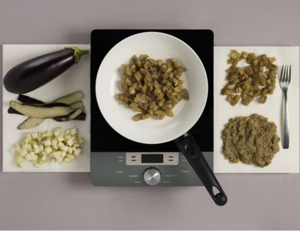 Peler les aubergines et couper les en petits dés. Les faire cuire dans un filet d'huile d'olive et un peu d'eau.