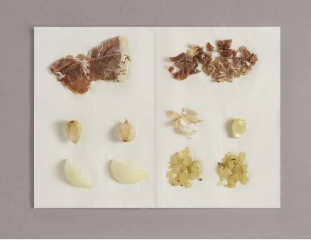 Prendre la moitié des ingrédients ayant servis à la cuisson des artichauts (oignon, ail et la poitrine). Garder le reste pour la vinaigrette.