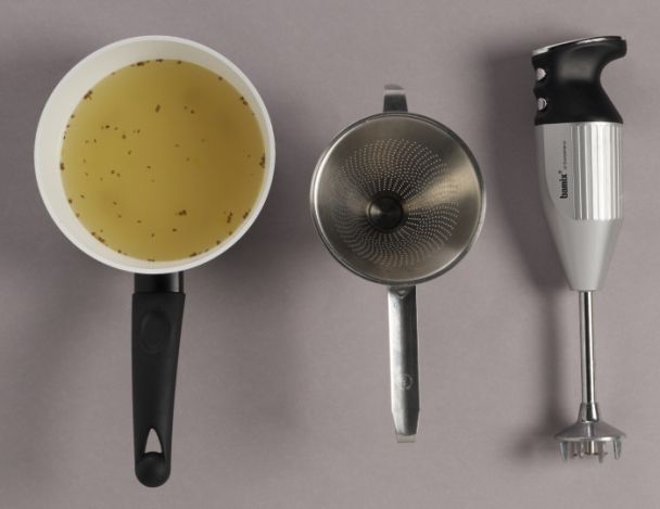 Mixer grossièrement et filtrer. Puis mixer une seconde fois avec l'huile d'olive.