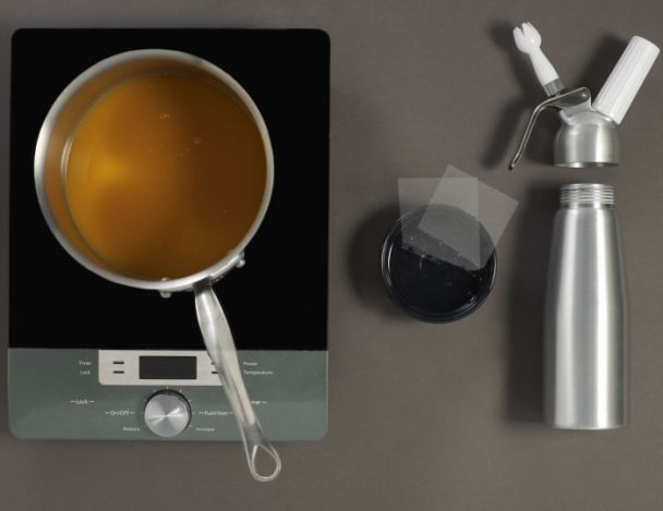 Se munir d’un siphon à chantilly. Presser les oranges sanguines et filtrer le jus à travers une passoire. Vous devriez avoir un demi-litre. Incorporer trois feuilles de gélatine. Chauffer légèrement le mélange pour faire fondre les feuilles de gélatine. Puis laisser refroidir. Une fois la gélatine incorporée, verser le tout dans la cuve à siphon puis « cartoucher ». 2 cartouches pour une cuve de 500ml, 3 cartouches pour une cuve de 1000ml. Bien secouer votre siphon et le réserver au frais pendant au moins 8 heures.