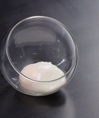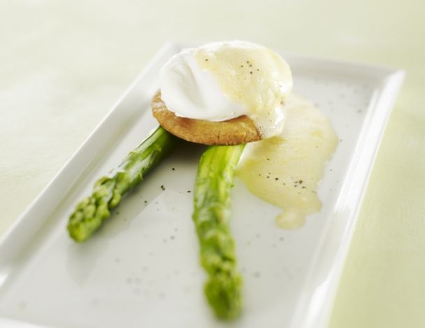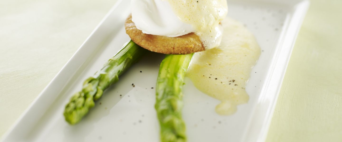 Dresser les asperges chaudes dans une assiette à soupe, ajouter l'œuf poché tiède, napper avec le sabayon et garnir avec le streusel.