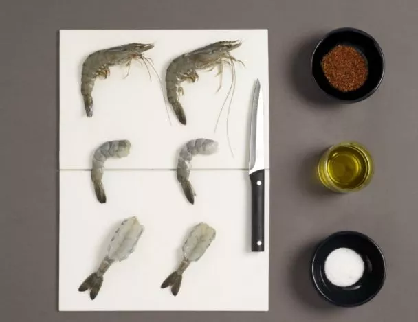 MoyenDécortiquer les crevettes en gardant le dernier médaillon et la queue. Ouvrir à l'aide d'un couteau le dessus du dos en gardant les extrémités jointes. Assaisonner de sel, piment d'Espelette. Badigeonner d'huile d'olive et réserver.
