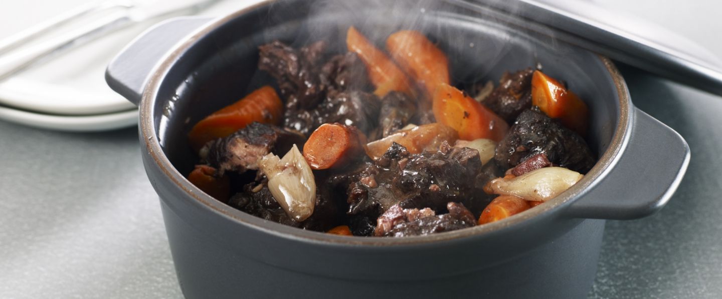 Rissoler la viande sur toutes ses faces dans une grande sauteuse avec de l'huile. Ajouter la garniture aromatique (carottes et oignons) et la laisser suer durant quelques minutes. Dégraisser soigneusement, singer, puis colorer la farine en plançant la sauteuse au four très chaud durant quelques minutes