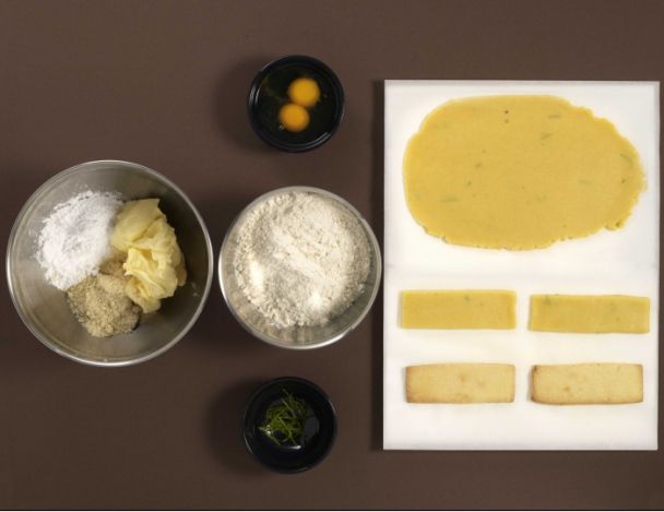 Réaliser un beurre pommade puis ajouter le sucre glace tamisé, la poudre d’amande, les œufs, les zestes de citron puis terminer par la farine. Étaler la pâte obtenue, sur 5 mm de hauteur. Refroidir au réfrigérateur puis détailler en rectangle.
