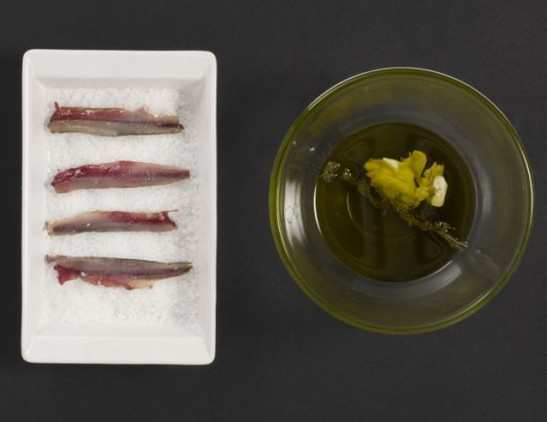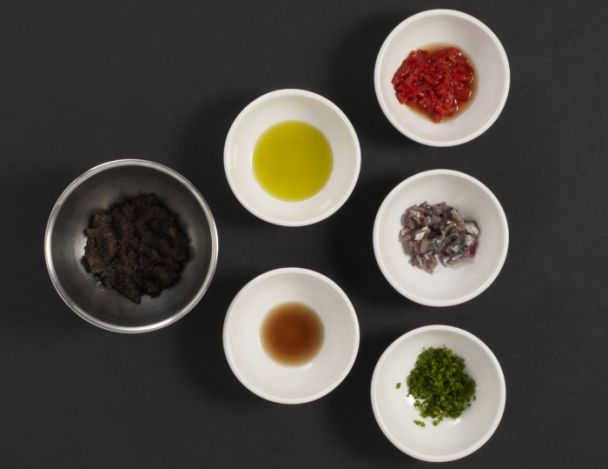 Détailler les filets d’anchois marinés en brunoise. Détendre la tapenade d’olive noires avec le vinaigre de xérès et l’huile d’olive. Ajouter les brunoises d’anchois et de pimientos del piquillo ainsi que la ciboulette ciselée. Réserver