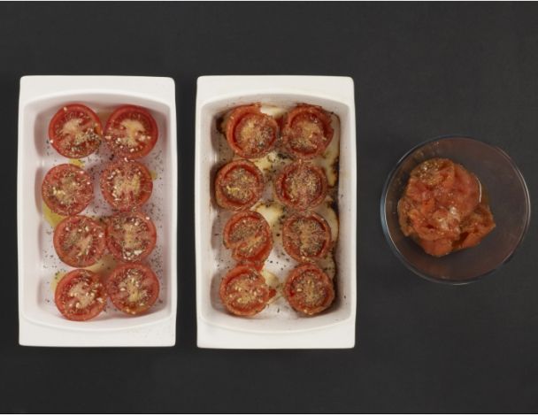 Tailler 6 tomates en 2, les assaisonner avec l’ail haché, les herbes de provence, huile d’olive, le sel, le poivre et le sucre. Cuire au four à 180°C pendant 45 minutes.