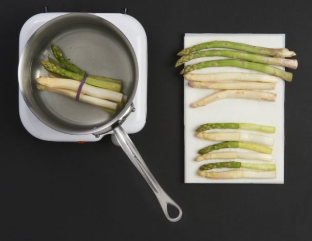 Couper les asperges d'une longueur de 15 cm et former une colorette à 8 cm de la tête. Eplucher uniquement les 7 cm restants. Ecussonner les asperges c'est à dire retirer les petites écailles. Ficeler les asperges en botte puis les cuire à l'anglaise c'est à dire les cuire dans de l'eau bouillante fortement salée, pendant 3 minutes, il est important de vérifier la cuisson avec la pointe d’un couteau, une légère résistance doit être ressentie.