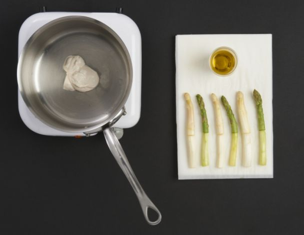 Fondre la crème de lard de Colonnata avec un filet l'huile d'olive dans une poêle, puis y rouler les asperges, rectifier l’assaisonnement, attention au sel.