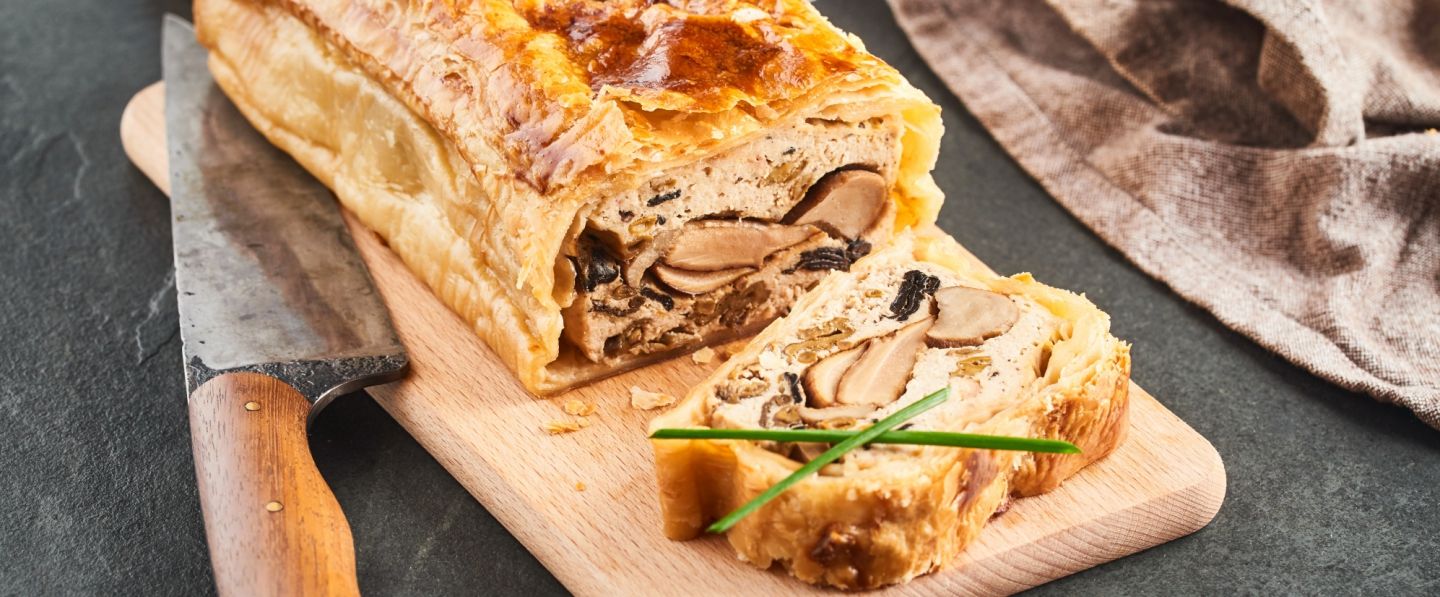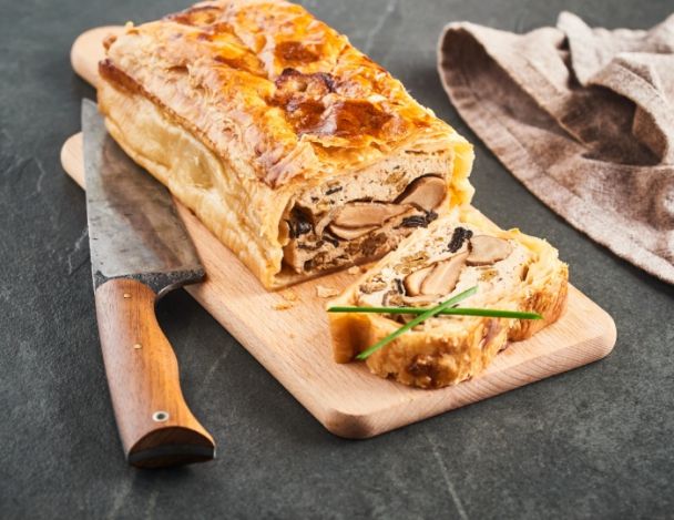 À la farce, ajoutez les herbes hachées, les trompettes de la mort et les girolles. Remplissez le fond du moule de cette préparation. Disposez au centre les cèpes parés bien serrés les uns contre les autres, finissez de remplir la terrine de farce. Recouvrez avec la pâte feuilletée de façon à ce que les bords se rejoignent au centre de la terrine. Dorez la pâte. Recouvrez toute la farce supérieure d'un rectangle de pâte et dorez à nouveau.