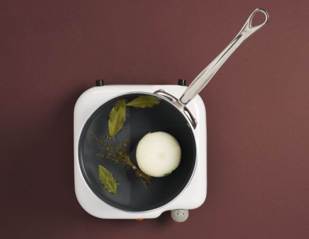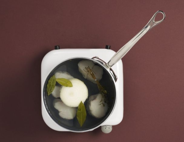 FacileDans une grande casserole d'eau salée, mettre l'oignon coupé en deux, le vin blanc, le thym, le laurier, le sel, le poivre. Porter à ébullition et laisser frémir 10 à 15 mn