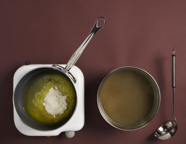 Dans une cocotte, fondre 30g de beurre. Ajouter la farine, bien mélanger et ajouter le court-bouillon filtré. Laisser réduire la sauce jusqu'à consistance sirupeuse.