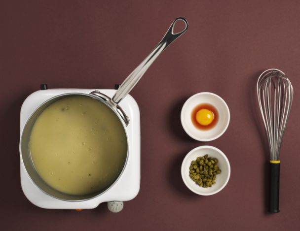En fin de cuisson, mélanger dans un bol le jaune d'oeuf et le vinaigre. Incorporer à la sauce et fouettant vivement. Ajouter les câpres. Rectifier l'assaisonnement.