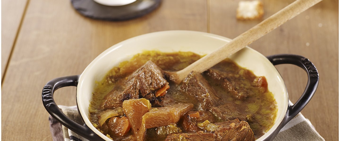 Découper la viande en gros dés. Dans une cocotte, faire chauffer l'huile. Faire revenir les morceaux de bœuf en plusieurs fois jusqu'à coloration sur toutes les faces. Déposer au fur et à mesure les morceaux dans un plat.