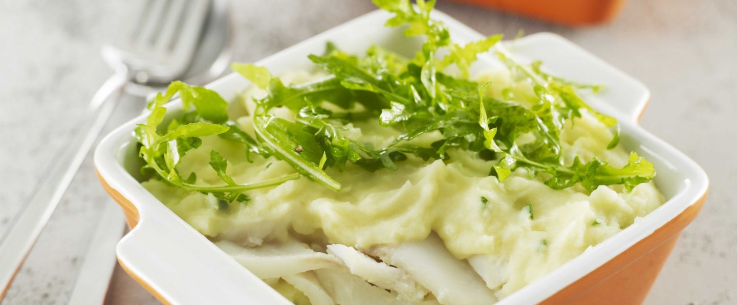 Dresser une couche de purée, surmonter de pétales de morue, recouvrir d'une deuxième couche de purée. Servir et ajouter la roquette assaisonnée.