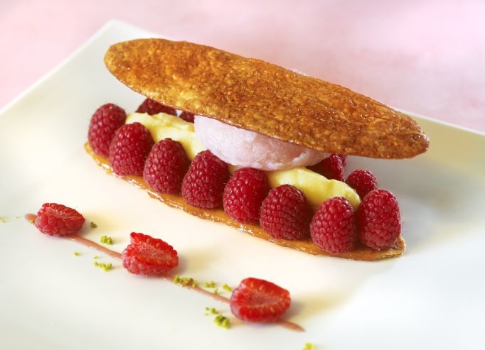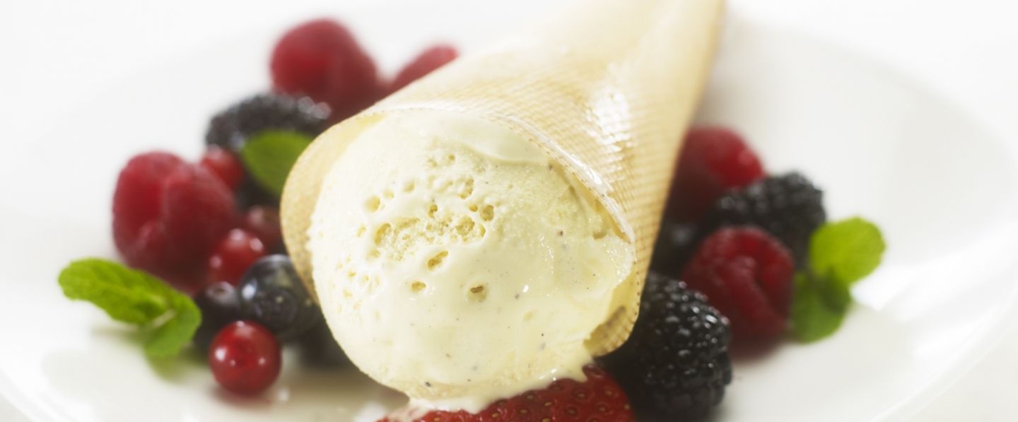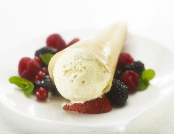 Ces bricelets juste croustillants, apportent texture et relief à la glace vanille teintée d'une touche acidulée de fruits rouges. On déguste sans modération ce dessert frais, aux saveurs et texture parfaitement équilibrées.