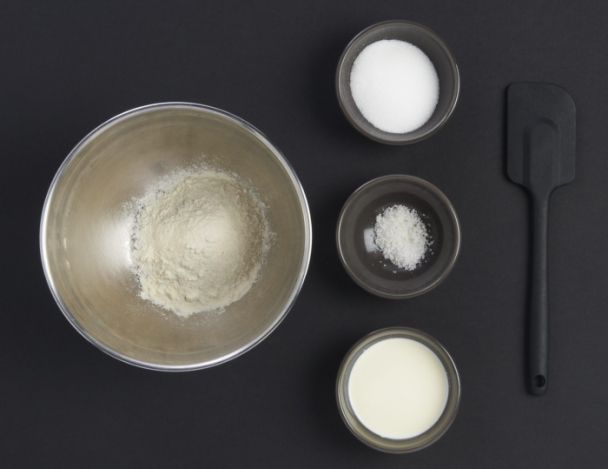 MoyenDans une jatte verser la farine, le sucre et le sel. Incorporer la crème et l’eau en remuant sans cesse.