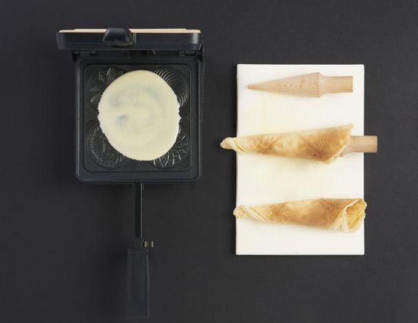 Quand le bricelet est cuit et a une belle couleur doré, donner lui la forme d’un cornet sur un moule en bois. (ou tout autre ustensile lui donnant la forme).