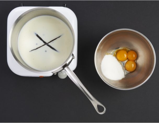 Chauffer le lait et infuser les gousses de vanille coupées en deux pendant 15 minutes. Travailler les jaunes avec le sucre deux minutes. Verser le lait infusé dessus en fouettant énergiquement.