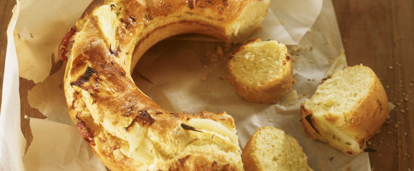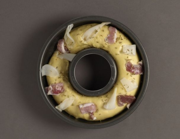 Laisser pousser 30mn puis glisser les pétales d’oignons dans le pli de la couronne ainsi que le lard et le carvi.